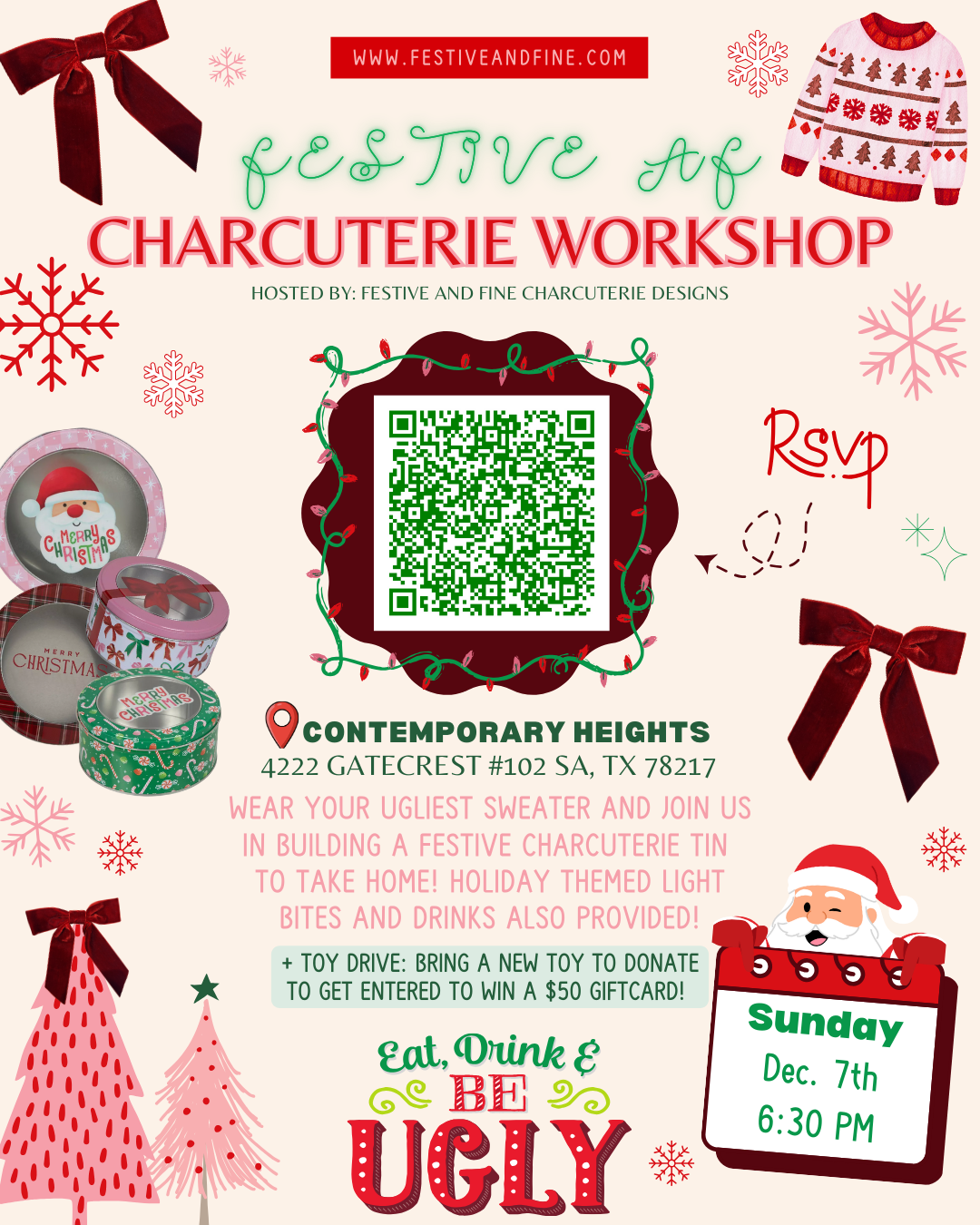 All attendees will get to make their own super cute charcuterie tin perfect for the holidays or even for gifting! Plus your toy donation will get you entered to win a $50 giftcard!